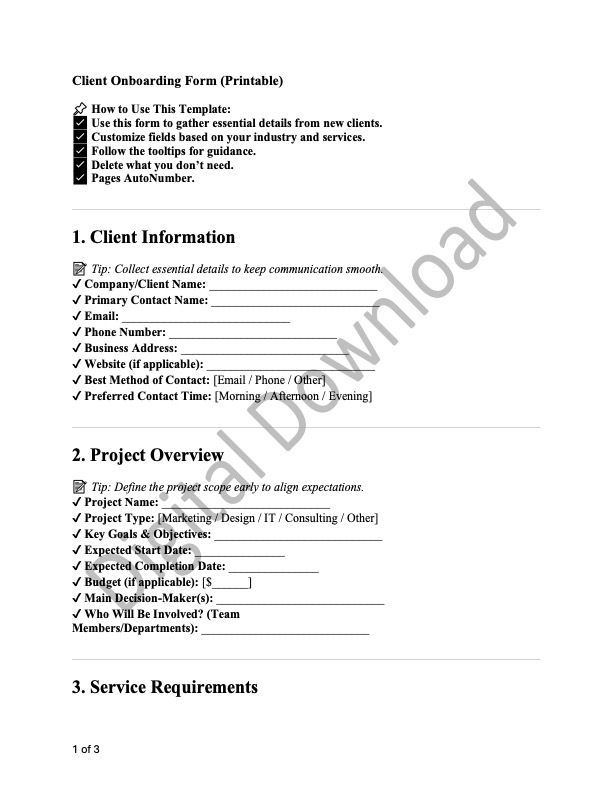 A structured onboarding template to help businesses and freelancers efficiently gather client details.