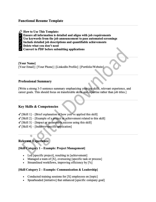 A functional resume template that highlights skills over job history, making it perfect for career changers, recent graduates, and those with gaps in employment.