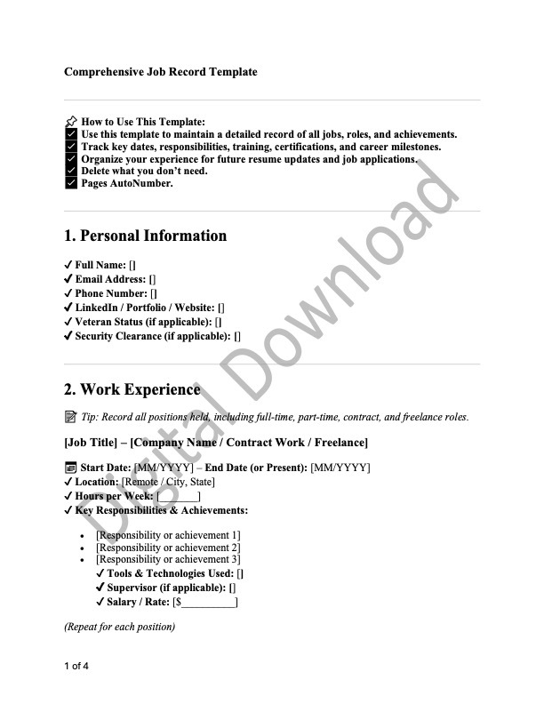 A must-have tool for career professionals and freelancers! This Comprehensive Job Record Template helps you track all work experience, certifications, projects, and skills in one structured document. Perfect for resume updates, career planning, and federal applications.