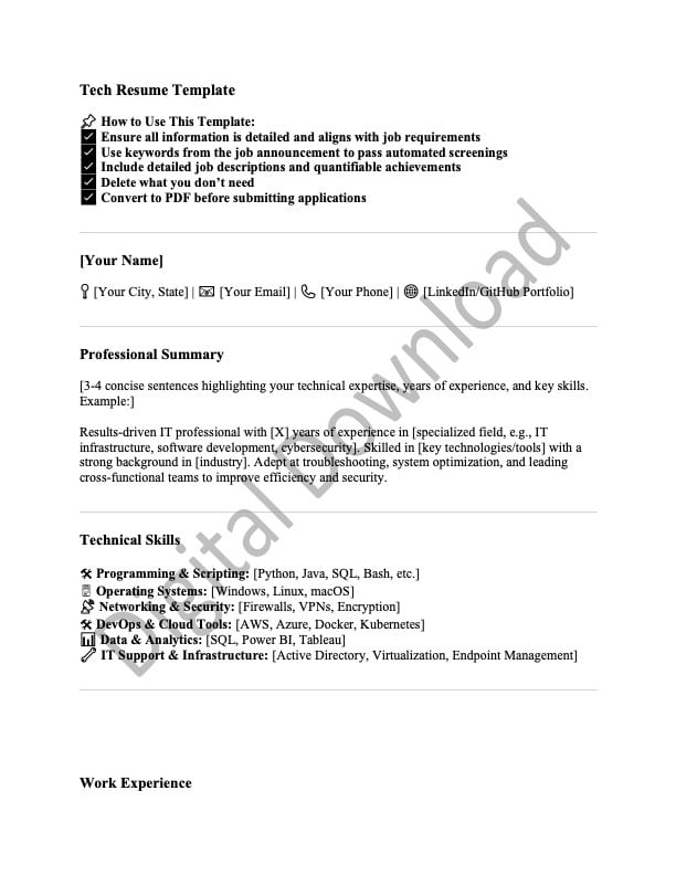A technical resume template tailored for software engineers, IT specialists, and data analysts. Optimized for ATS systems in tech hiring.